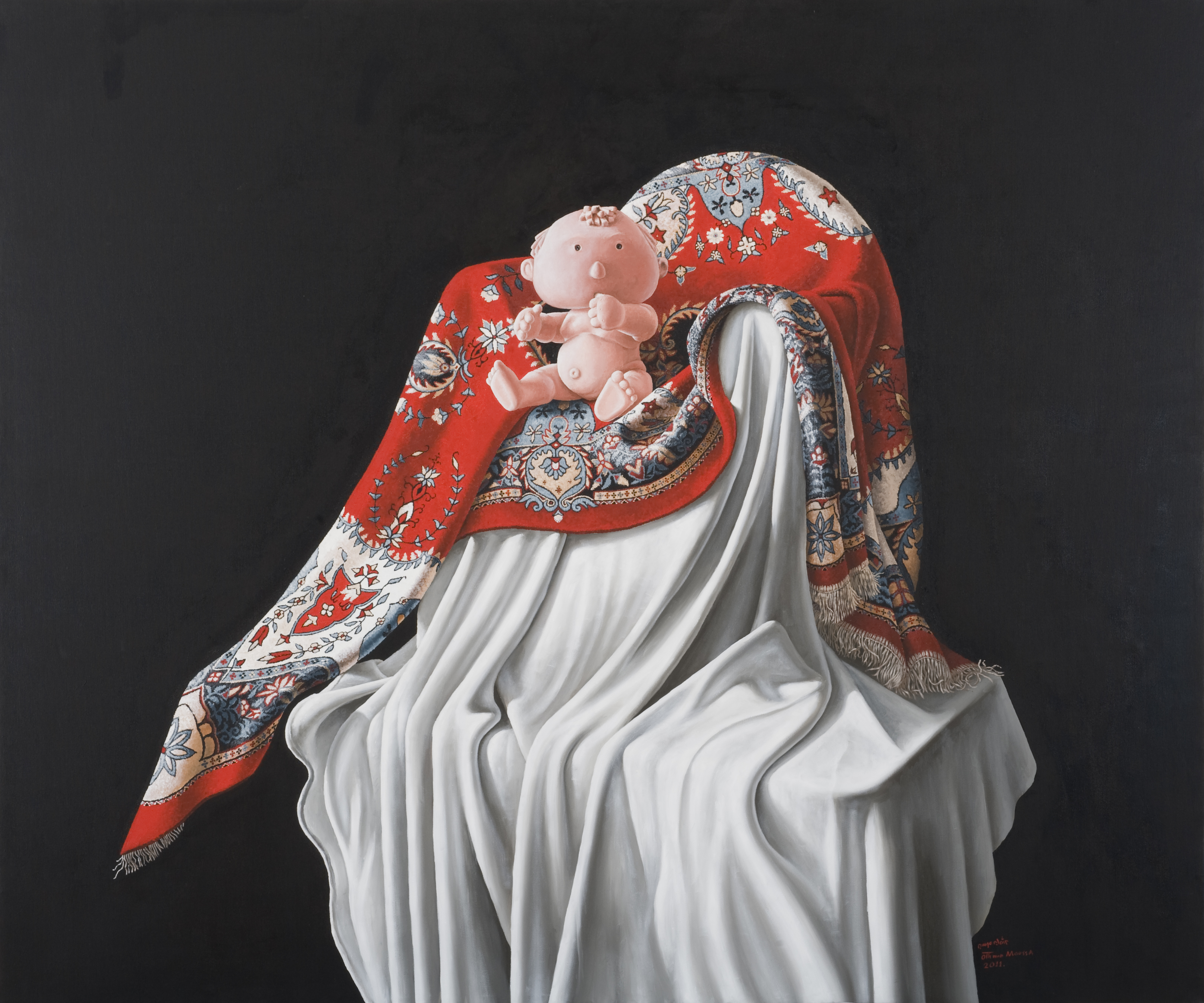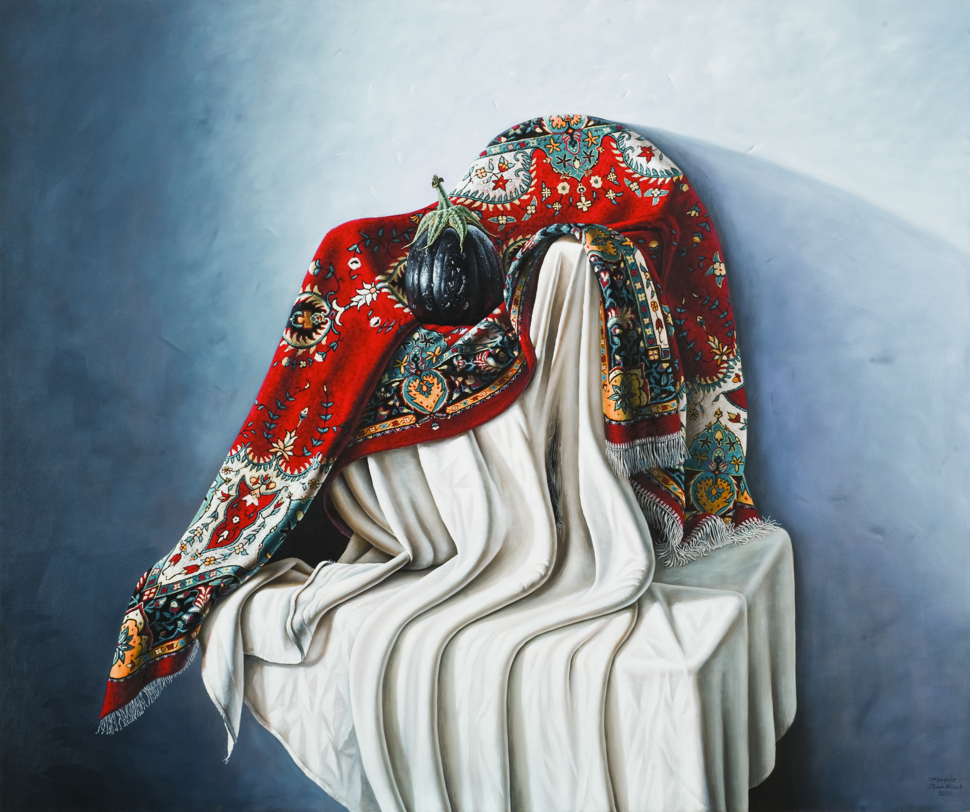On March 19, Ayyam Gallery, Dubai (DIFC) will present Othman Moussa’s first solo exhibition, “The Throne”. Upholding his superb draughtsmanship and influences of seventeenth-century Dutch realism, Moussa’s new works veer away from traditional still life painting of inanimate objects within Syrian life that quietly and poetically speak to the viewer, to a form of still life that shouts. Beautifully rendered, an oriental carpet covers a heavily draped armchair. It is the objects that occupy this throne, which present a satirical, subdued political commentary.