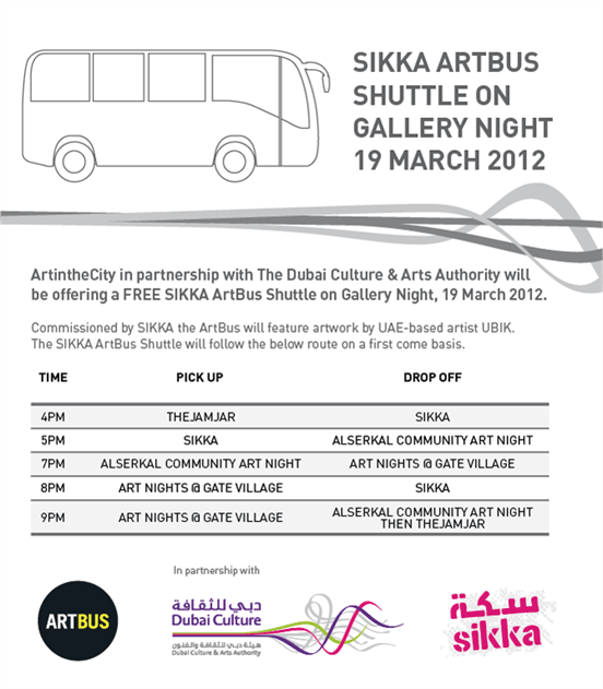 The other good news is ArtintheCity in partnership with Dubai Culture and commissioned by SIKKA 2012, will be offering a FREE shuttle ArtBus to transport passengers between thejamjar, SIKKA, Alserkal Community Art Night and Art Nights @ Gate Village! Find below details: