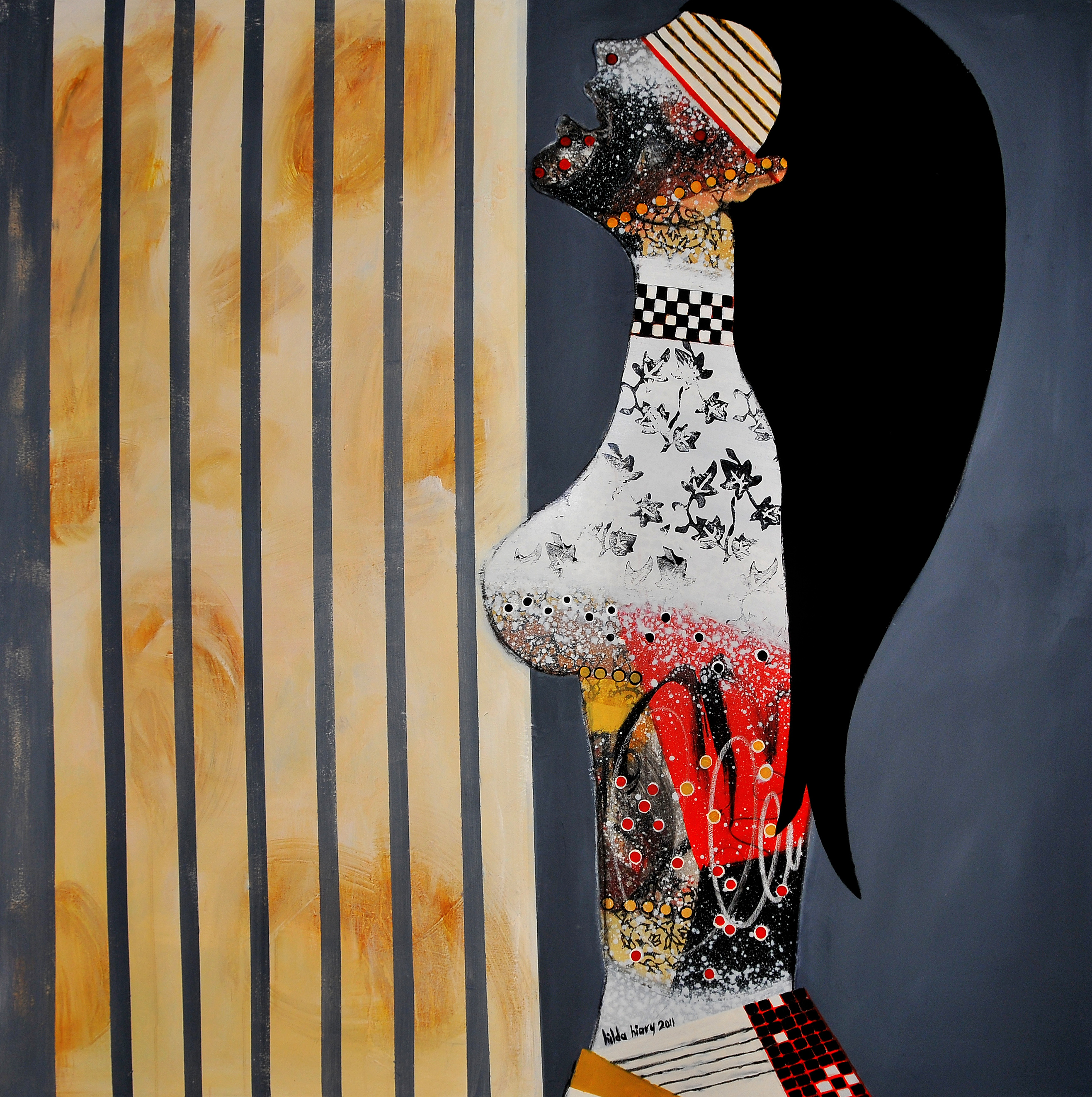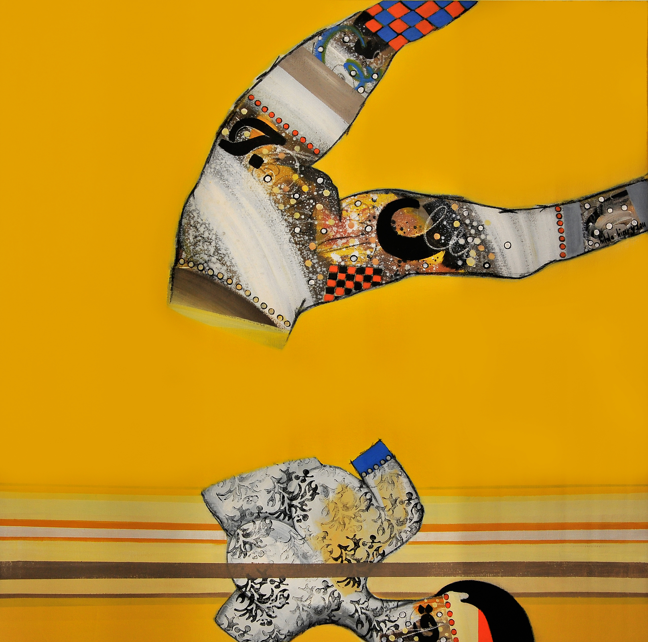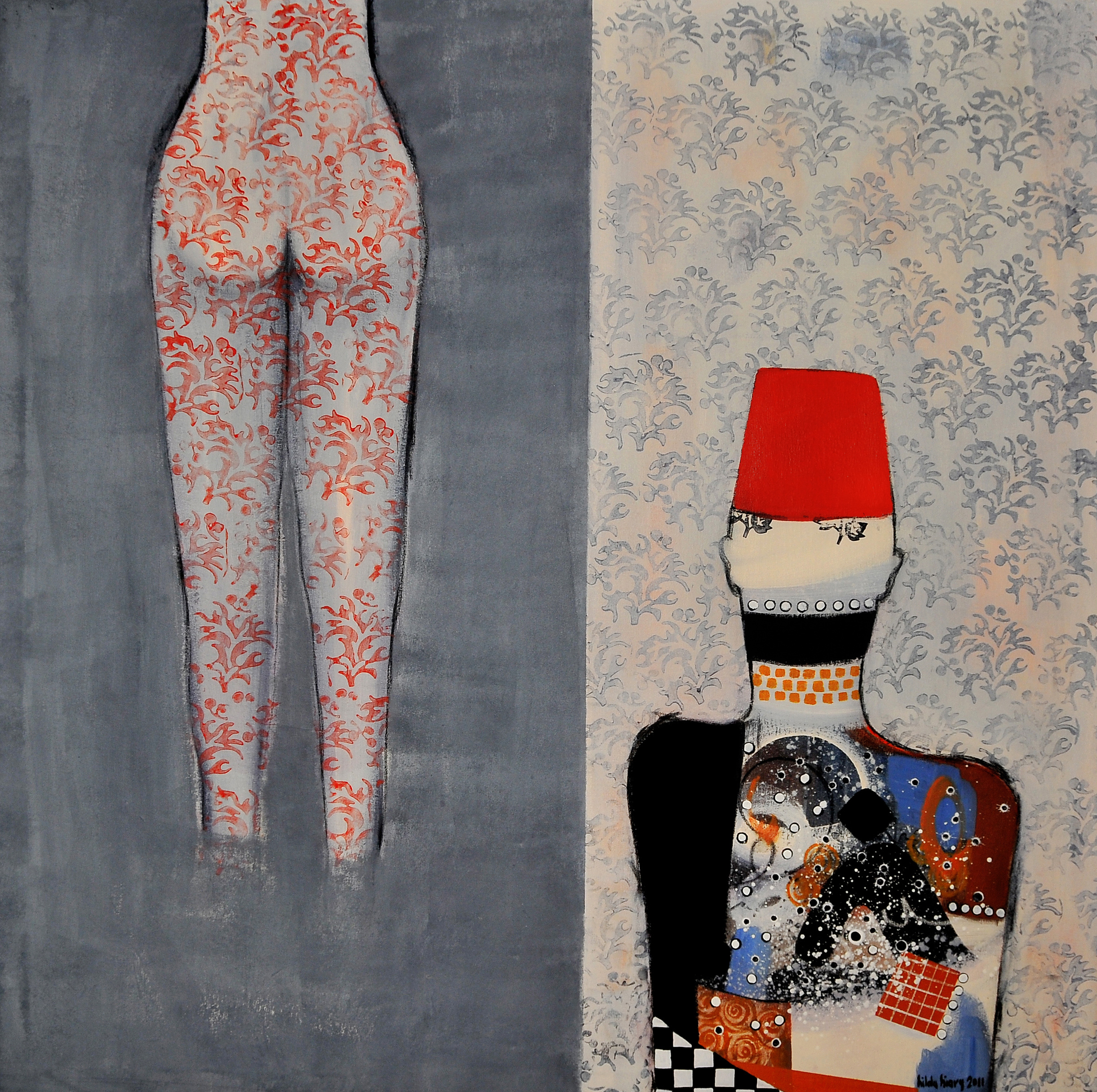 In her series “Impulses” Hilda uses strong colors, patterns & large figures to maximize delivering an idea and emotions, effected by the events and drastic changes the Middle East is witnessing since last year that has moved the region into a new era. What captivated me in Hilda’s paintings is anyone can feel a link to it. For example “The Map” she outlines a woman’s figure from her upper lip down to her breast but somehow wrapped and can’t move, also the only figure that is clearly showing is her red lips. When I look at this artwork on an incomplete woman -which is my favorite- I see a captured beautiful human trying to release himself from all restrictions which are wrapped around him & seizing his/her impulses of freedom. But after reading its name, it could mean the map authorities draw to maybe seize our movements, defining the ‘allowed’ locations within it. That is what I mean by one can interpret and link to the painting in a way or another, you won’t feel disconnected from any of her artworks. Hilda mastered utilizing symbolism and realism to captivate you within it.