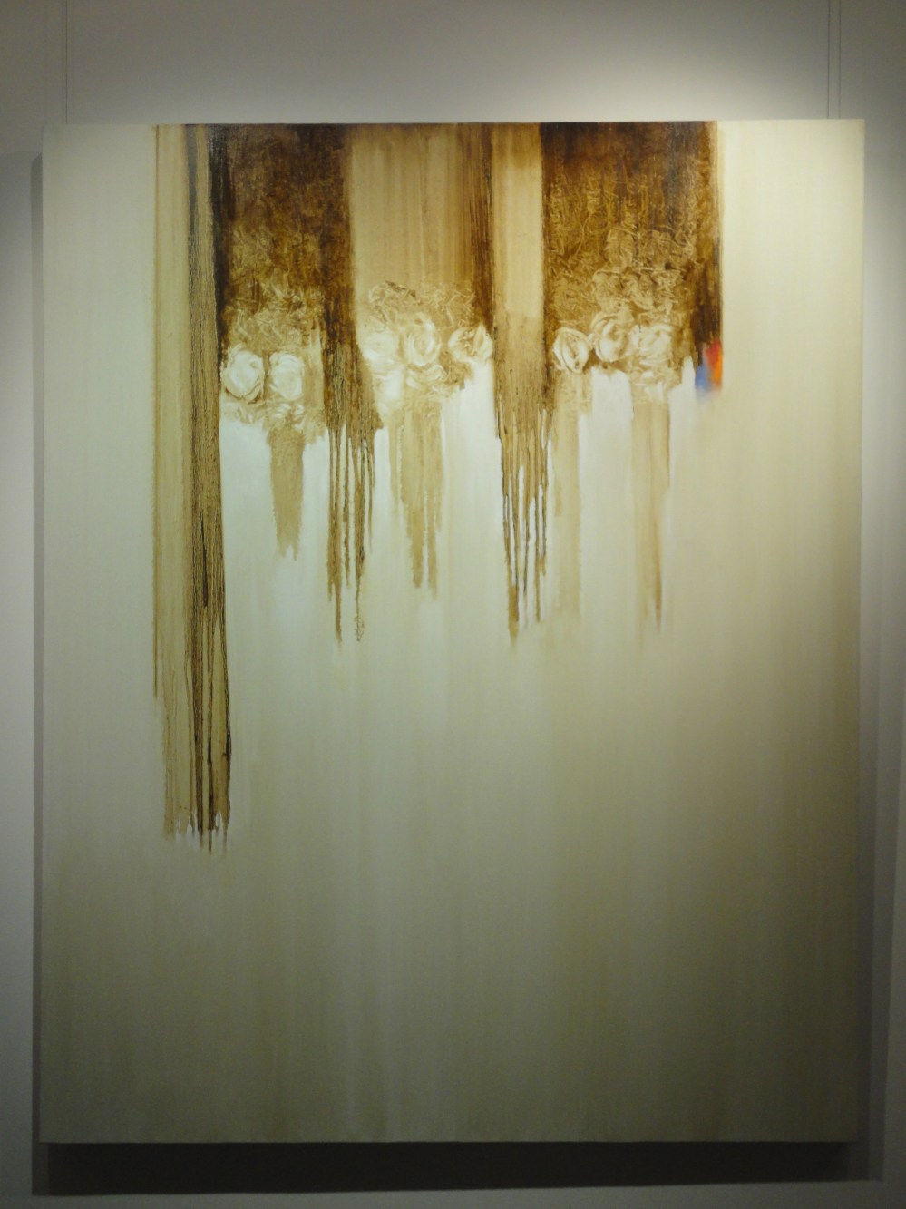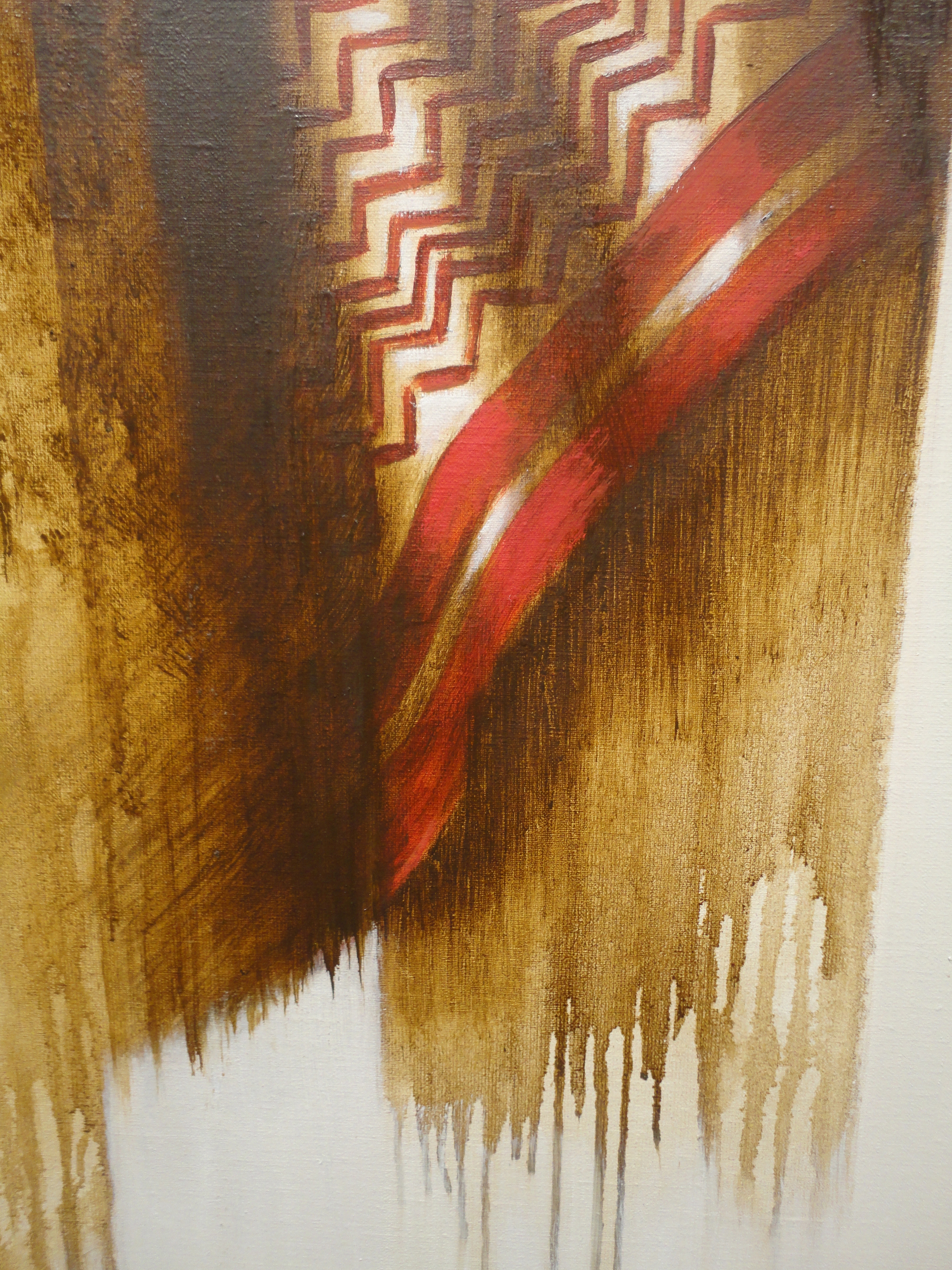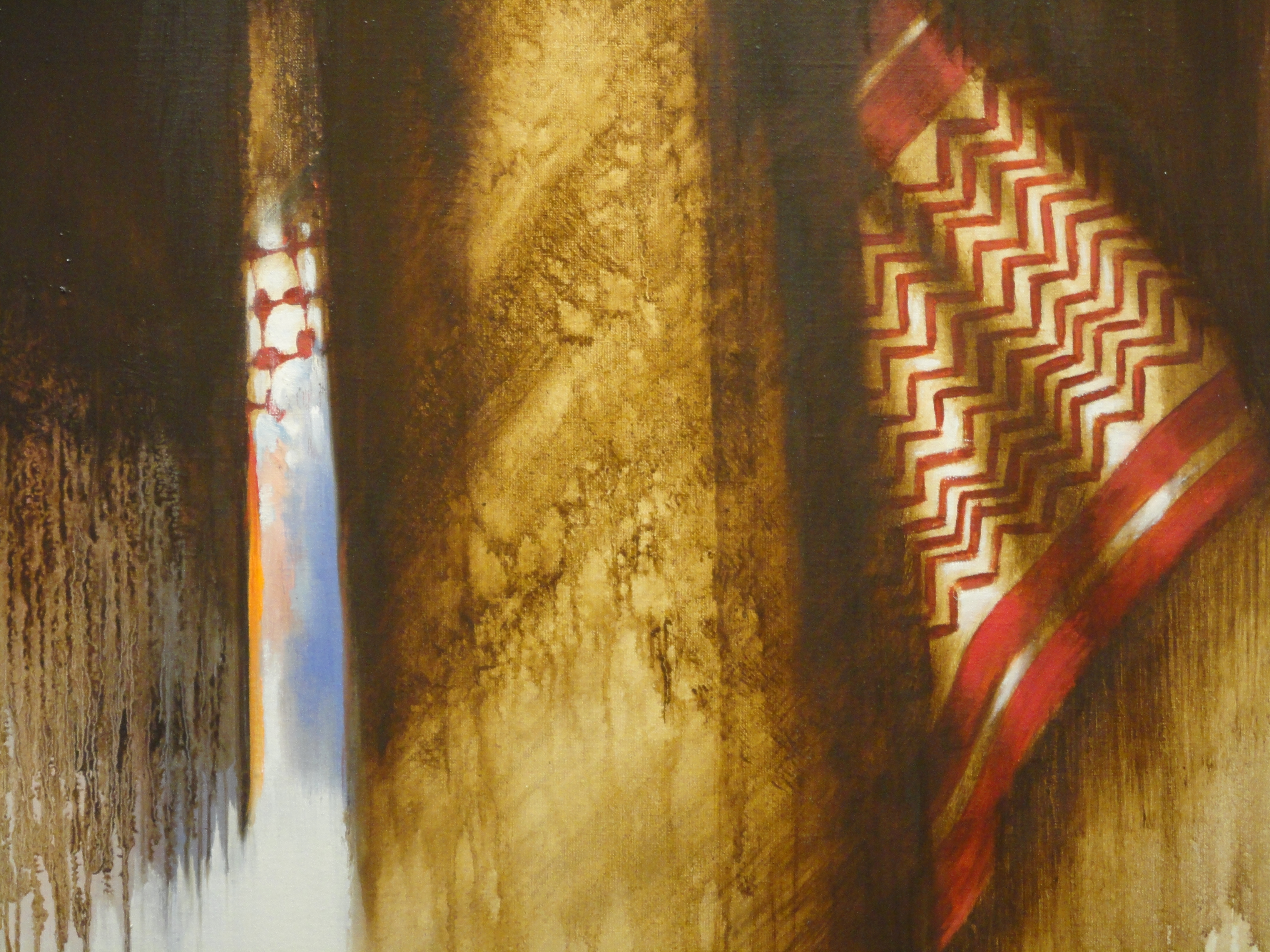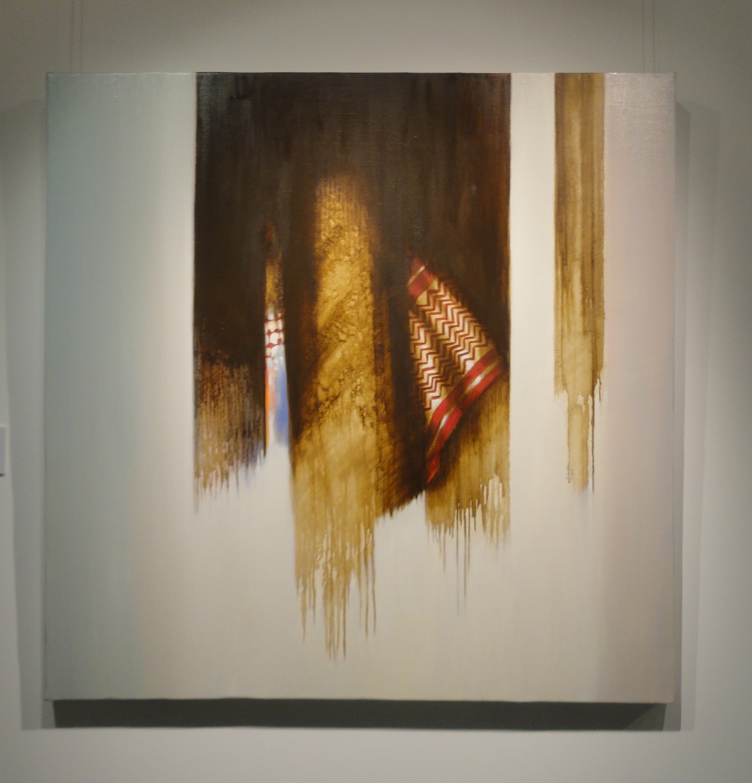 Although I loved the calmness & harmony of colors Abdul Rasool used, I only wished there were more diversions & unexpected twists in some works where can cause a sudden shock of the calmness one feels. I am not a big fan of still-life art because it is too quiet, obvious thus doesn’t move my imagination or trigger curiosity to ask “what? why? how”. Although these are abstract ‘still-life’ portraying “culture” as Abdul Rasool said, the “IT” element was missing & couldn’t make me click with some of the artworks. And I should emphasize that it is not the technique -oil paints on canvas- that prevents from adding a contemporary sense in it, it was smartly selected to convey the calmness and seniority of culture. The below artwork was my favorite among all, I loved the peaceful feeling Abdul Rasool created between one’s identity & society’s identity! This is a state of peace that a lot of people want to reach in their lives, the constant conflict between what we want to be and society’s obligations & expectations. In this particular painting, Abdul Rasool made me feel he reached an inner peace were he became who he wants under the umbrella of the society not away or isolated from it.