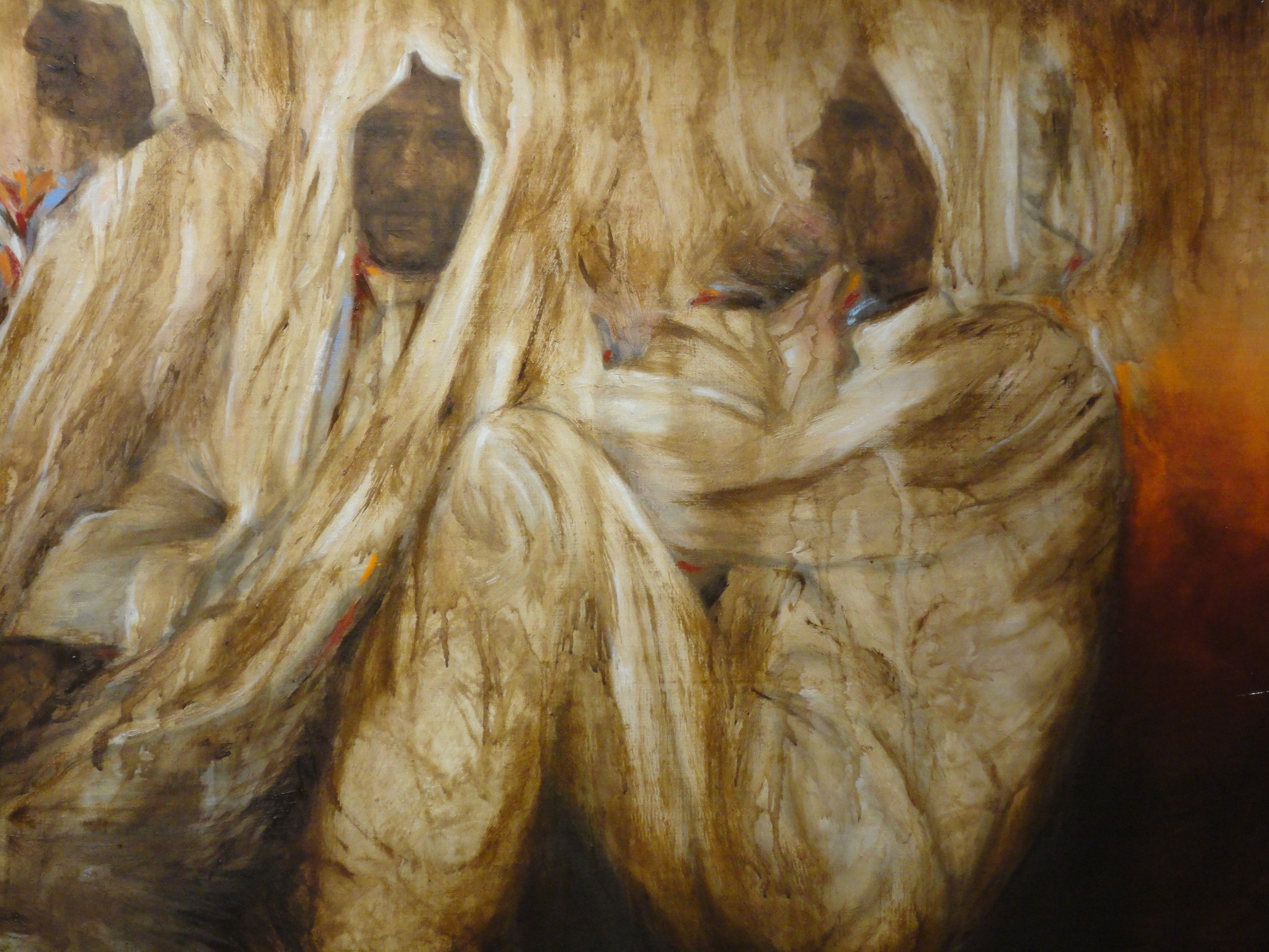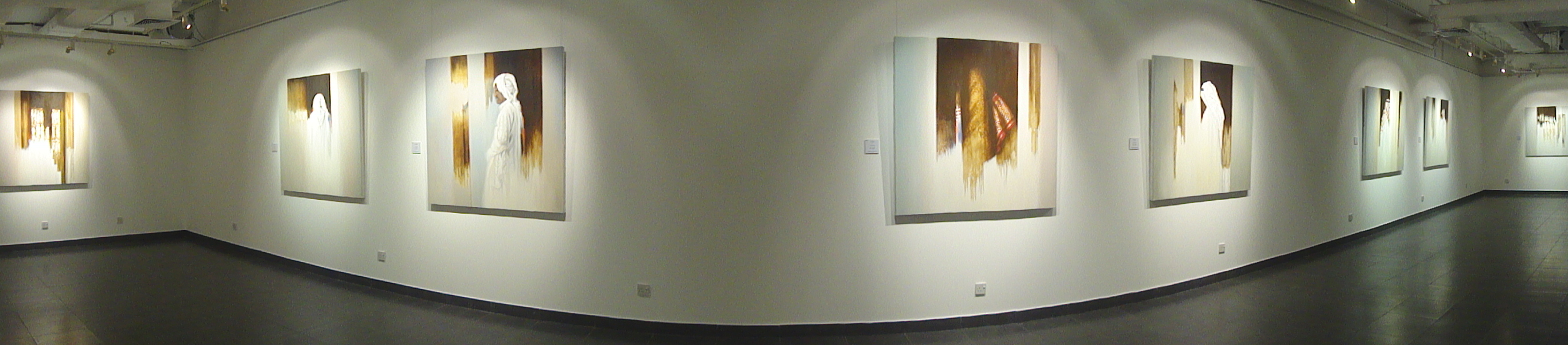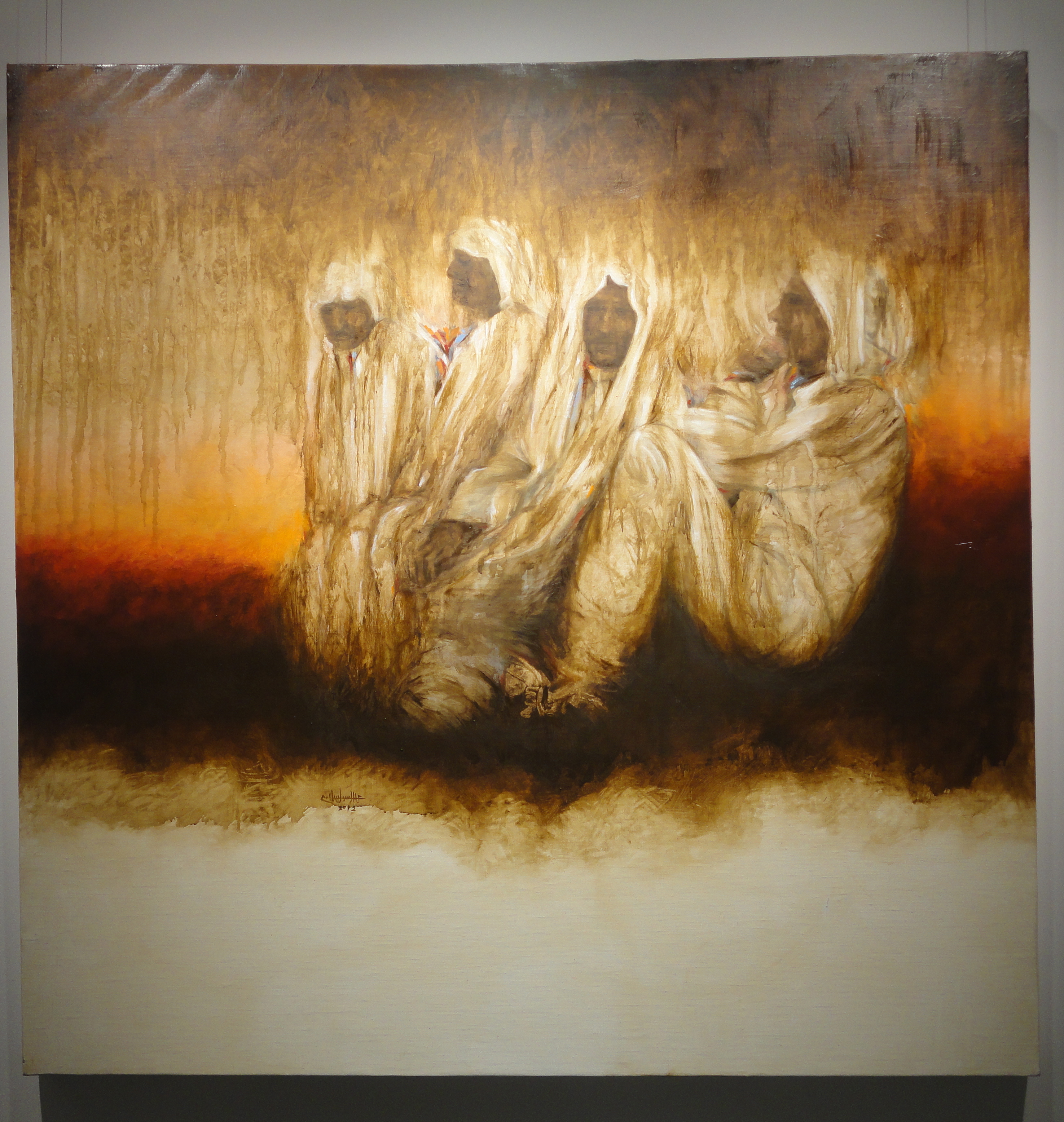 Calm colors of oil cascaded peacefully on large canvases gave a serene atmosphere while stepping into Abdul Rasool world. He portrayed the back of man or two men, wearing the traditional custom by Kuwaitis. Some artworks the face features were blurred, but remained calm. There was no motion or movements in them; it was a reflection of still-life in a human figure.