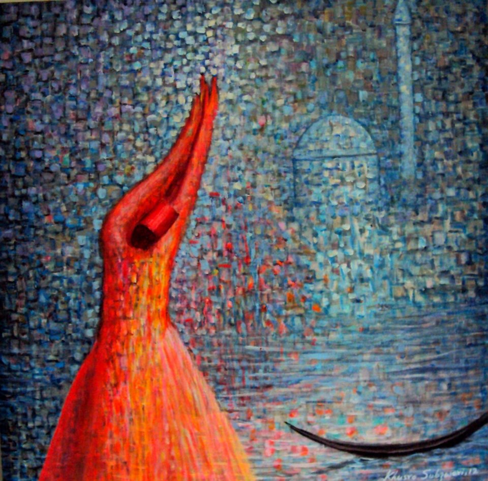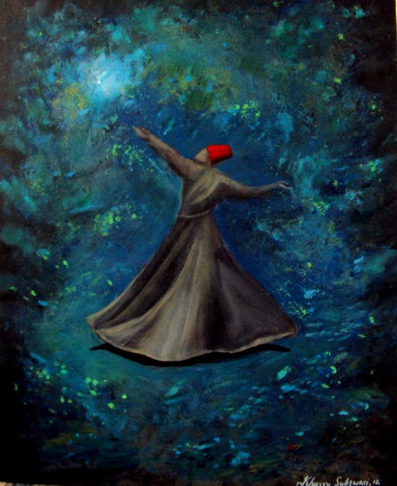 Kusro Subzwari presented to Al Mahha readers 2 paintings greeting them for Ramadan, reflecting how he view this month in as “Sufi whirling” very dynamic and spiritual move aim to reach the source of all perfection through abandoning one’s ego and personal desires by listening to the music, focusing on God, and spinning one’s body in repetitive circles, which has been seen as a symbolic imitation of planets in the Solar System orbiting the sun. The blend of colors in Subzwari paintings adds harmony even when using strong bright colors, or dark ones, it doesn’t feel too bright or too gloomy. For more paintings and artworks of Subzwari, click here.