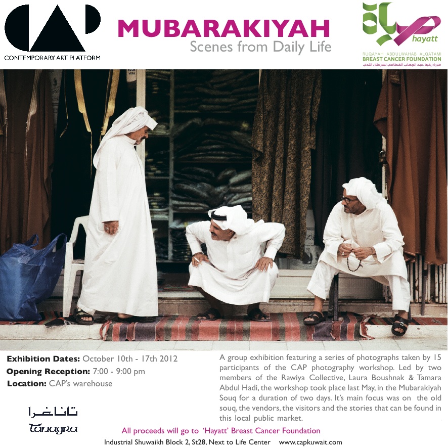 What: A group exhibition featuring a series of photographs taken by 15 participants of the CAP photography workshop. Led by two members of the Rawiya Collective, Laura Boushnak & Tamara Abdul Hadi. All proceeds will go to “Hayat” Breast Cancer Foundation.