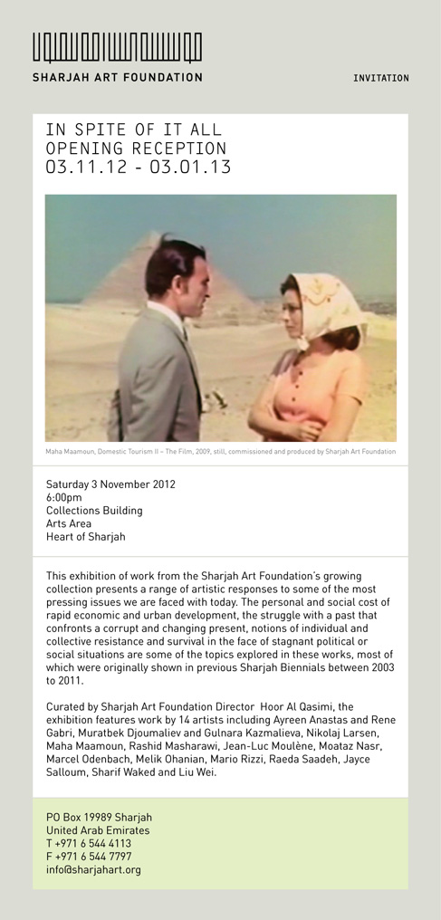 What: (Inspite Of It All) an exhibition of work from the Sharjah Art Foundation’s growing collection presents a range of artistic responses to some of the most pressing issues we are faced with today. Curated by Sharjah Art Foundation Director Hoor Al Qasimi, the exhibition features work by 14 artists including Ayreen Anastas and Rene Gabri, Muratbek Djoumaliev and Gulnara Kazmalieva, Nikolaj Larsen, Maha Maamoun, Rashid Masharawi, Jean-Luc Moulène, Moataz Nasr, Marcel Odenbach, Melik Ohanian, Mario Rizzi, Raeda Saadeh, Jayce Salloum, Sharif Waked and Liu Wei.