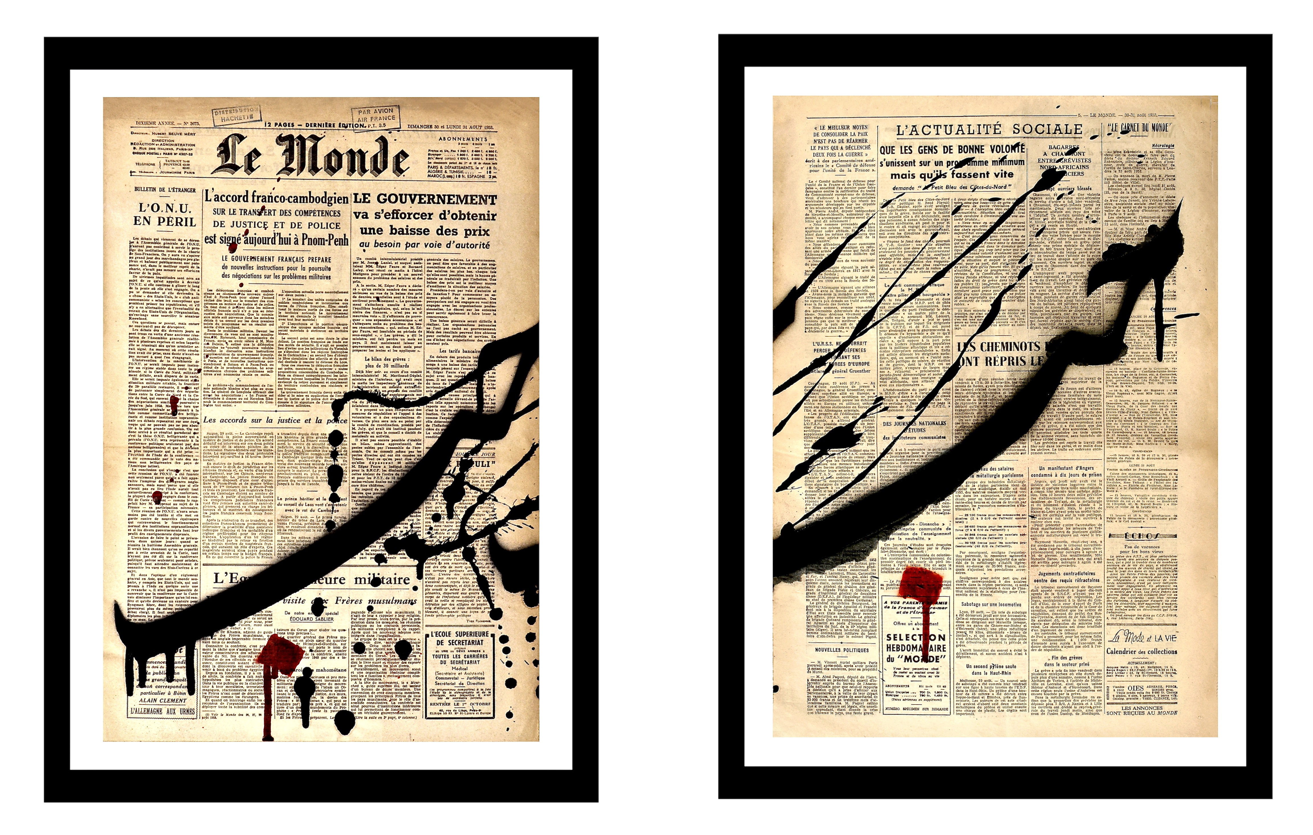 Each artwork in “Kalimat” is a separated two piece of vintage newspapers, written on them the word ‘Hob’ -Arabic word of Love. Although all artworks are inspired from different love story; they all depict the deepest sorrow of broken hearts.