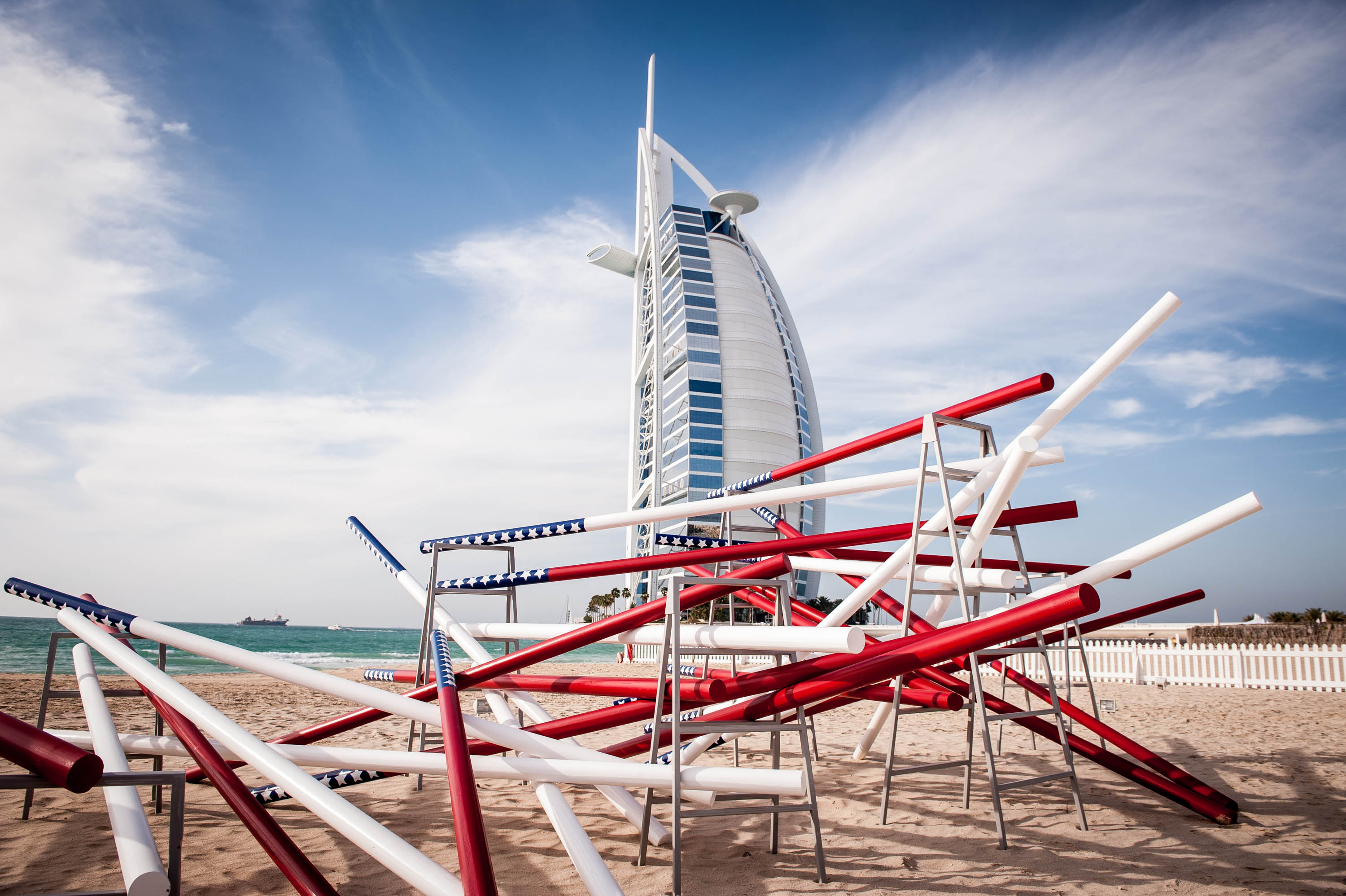 Mounir Fatmi ‘I Like America’ Sculpture on the Beach. Courtesy: Art Dubai.