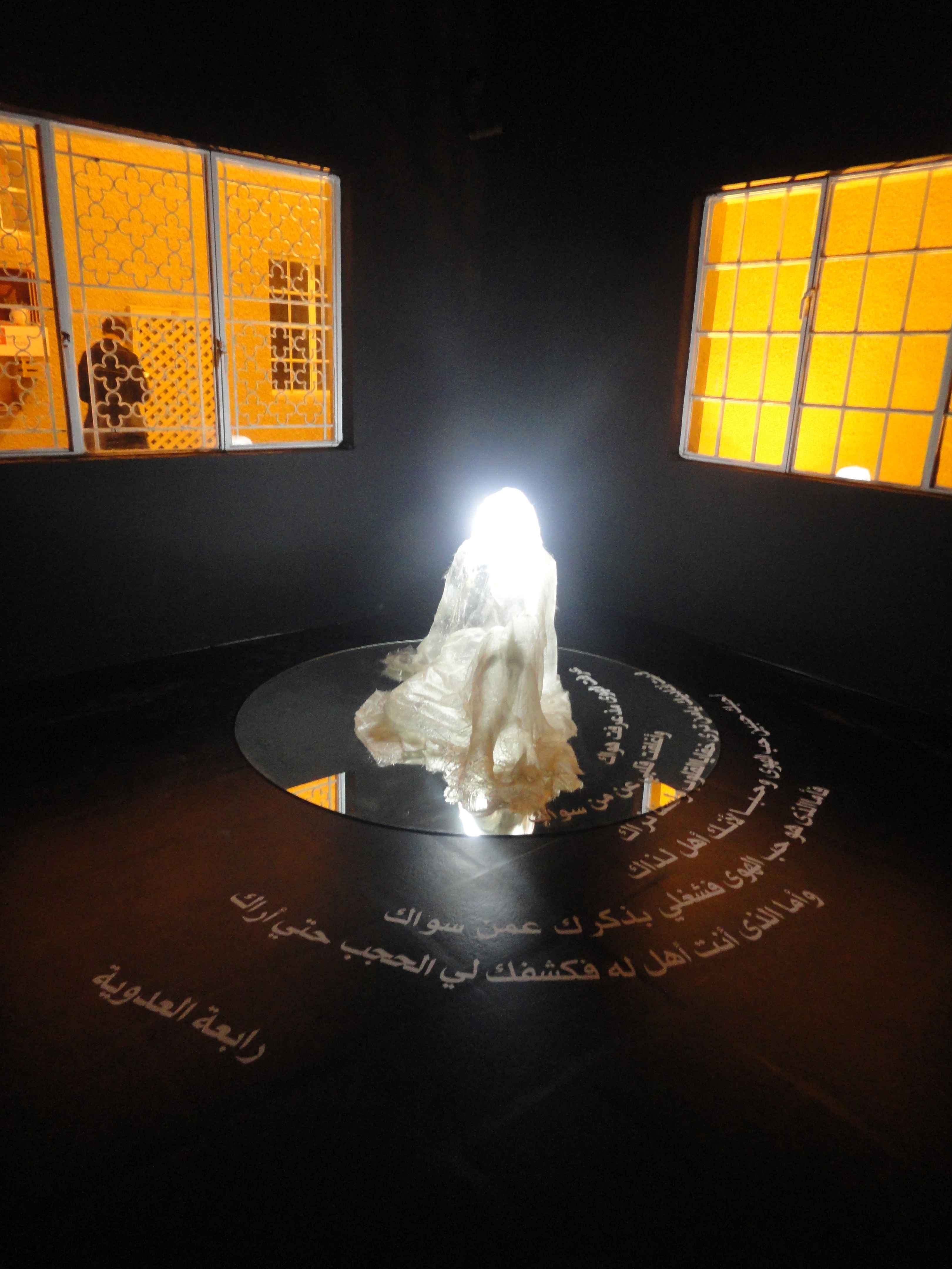The first house we entered – by coincidence!- was Emirati artist Fatma Lootah’s .. It was the first time I get the chance to see her timeless work in real which varied from paintings to installations based on famous poets such as Rab’aa Al Adaweya… Figures in Lootah’s works depicts captive women, covered with heavy materials surrounded with unseen traditions, laws, and restrictions or perhaps a tiring relation or maybe regardless of how fancy or liberal your surroundings, but is feels like cage. All these things feel like a burden holds us from moving, paralyze us and forms us into one caged creature that can only move within what is allowed. The depth in each work keeps you speechless…