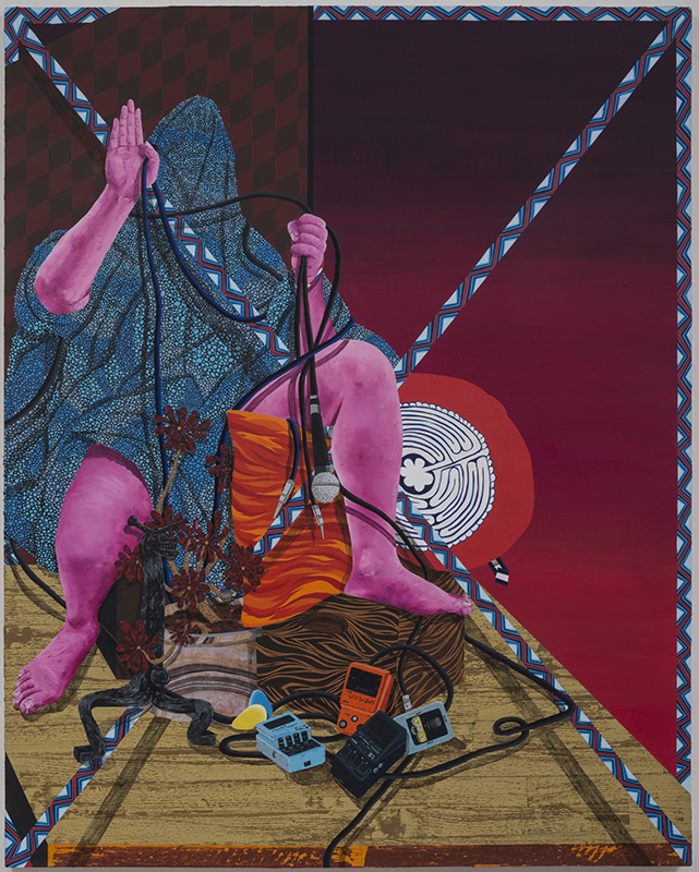 Amir visited collectors’ residences in Dubai more than a year ago and staged the portraits by gathering various material belongings from within their homes as markers of their identity, particularly gravitating toward those mundane objects that seem loaded with sentimental meaning – a worn afghan, an idiosyncratic plant, a figurine or running shoes. After carefully assembling the composition through collaborative efforts with the subject, he photographed the setting and used the image as a starting point. The works further changed in his studio when transferred onto the canvas and evolved through his personal interventions and stylized interpretation, telling the patrons’ personal histories through his eyes.