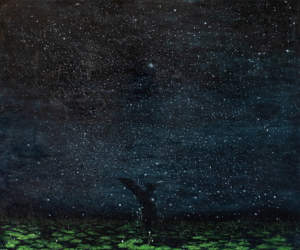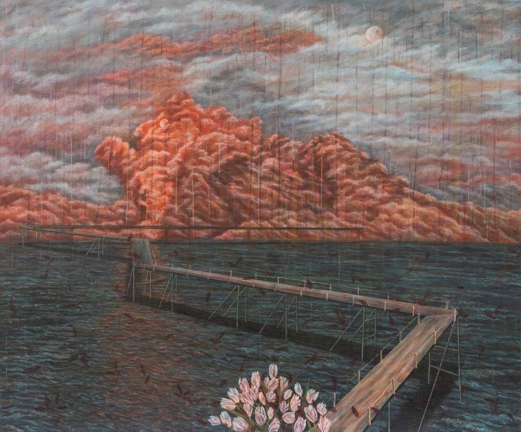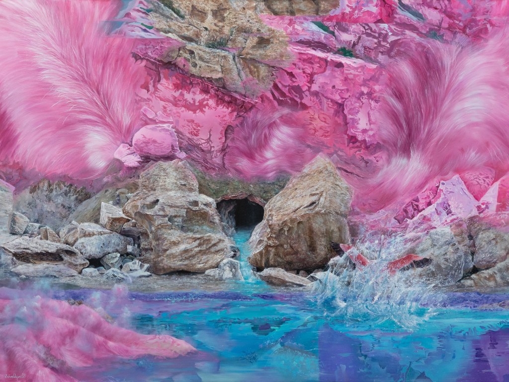The illusive and deceptive notion of water is always present in Mahsa Nouri’s works. Here, in her “Immerged in Daydreaming” series, she creates a peculiar, polychromatic world. Mahsa seems to have taken this world out of her dreams so that purification from the evils of the real world is made possible.
