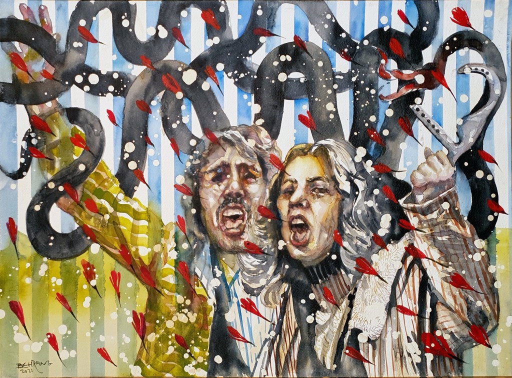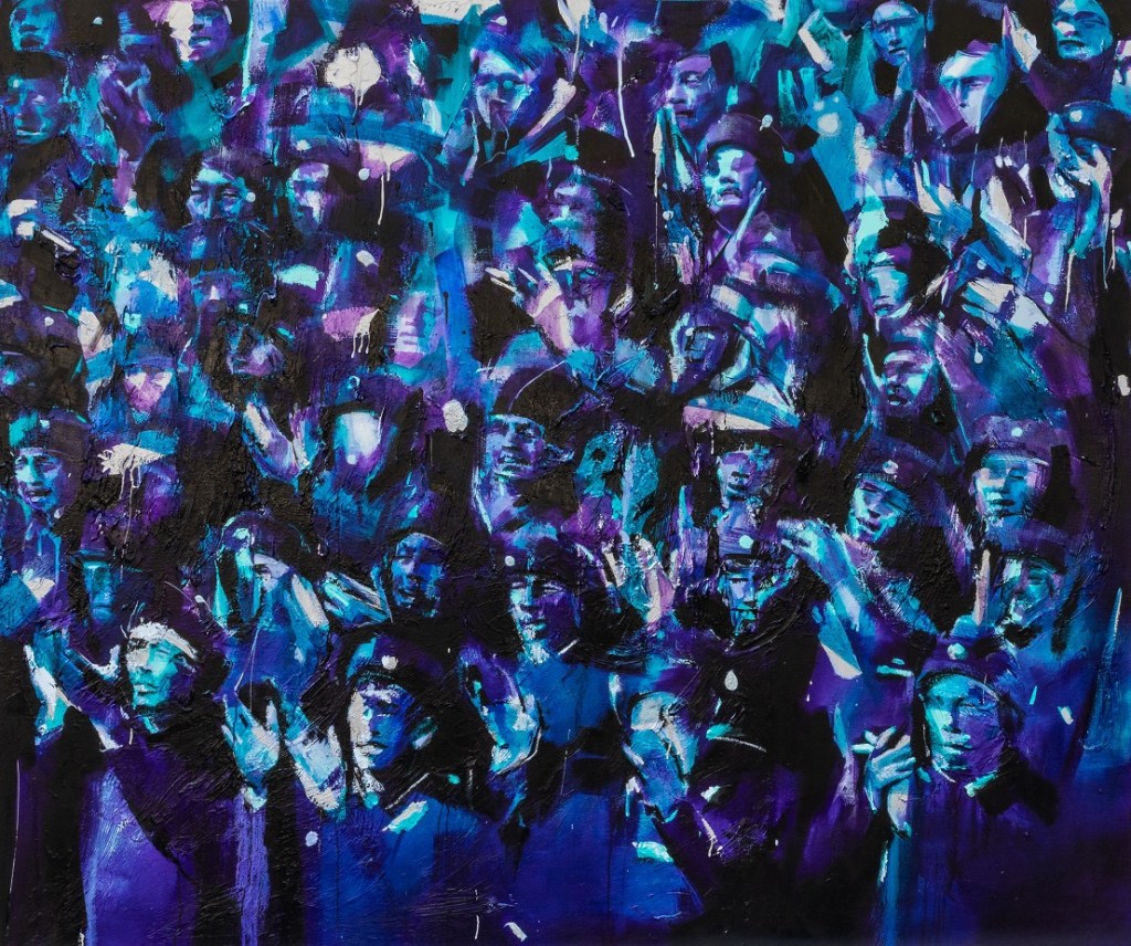 In “Applaud,” Amir-Hossein Zanjani represents dis-figures that are unrelated, while they are simultaneously entangled. Similar to his previous series, Zanjani uses bold colors to explore sociohistorical issues and contemporary militarism in the midst of a multitude of lonely bodies, whose identities have been destroyed and sunk into the background.