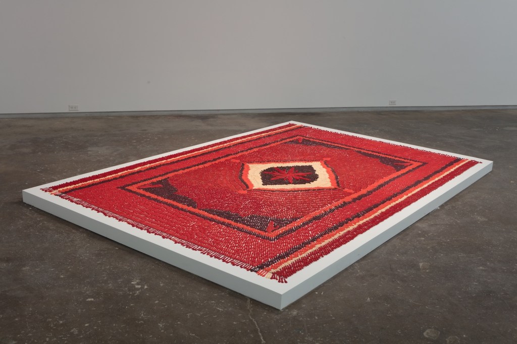 Imbuing the sacred tradition of miniature painting with contemporary concerns and practices that involve sewing, cutting, weaving, and etching, Ambreen Butt(Pakistan, b. 1969, Dallas-based) gathers memories, experiences, and accounts of lives passed, into her works on paper and installations. Three Fates includes new collages from her Say My Name series. Created as a means to explore the relationship between power and vulnerability and to pay homage to innocent lives lost, each artwork incorporates the name and age of a single Afghan or Pakistani child or woman killed in U.S. drone strikes. Butt stains paper in tea, then separately and repeatedly writes or prints out the person’s name, shreds it into pieces, and arranges and glues the shredded fragments to her tea-stained paper in dense, swirling patterns. This process, undertaken with repetitive and transformational urgency, reconsiders the ripping, tearing action of a drone strike in order to elevate the names of its victims into shapes of exquisite grace and enduring strength. Three Fates also includes I am my lost diamond 2, a 9’ x 12’ floor-based installation of resin-cast digits on plexiglass that was inspired by a friend’s story of narrowly escaping a suicide bombing in a bazaar near Lahore.
