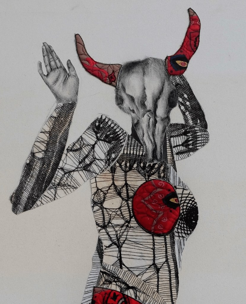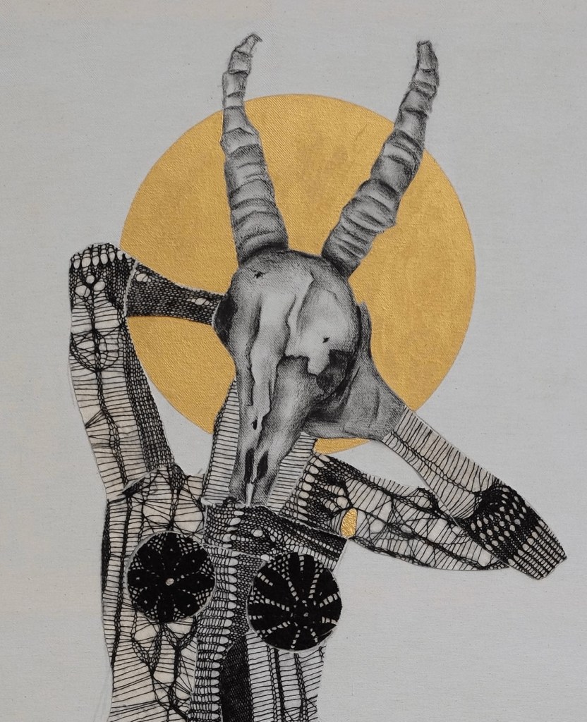 The thread forms the main element in my work. In this technique, I am inspired by the Greek mythology (Arachne and Penelope), Ancient Egyptian (Isis), and Native American Navajo Grandmother Spider, the feminine archetypes of creation and magic, where the vulnerable world of the male God was always fixed by the female’s threads. But the transition from line to thread in my works is not a random act.