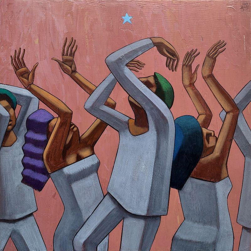 The sun, stars, and birds make an appearance in a few of the paintings, breathing life into the collection and suggesting the figures are, in fact, outside. In some pieces, the figures look up longingly to the starry or sunny sky, in others, they dance in an almost spiritual appreciation of the great outdoors. And in yet others, they simply appear at peace.