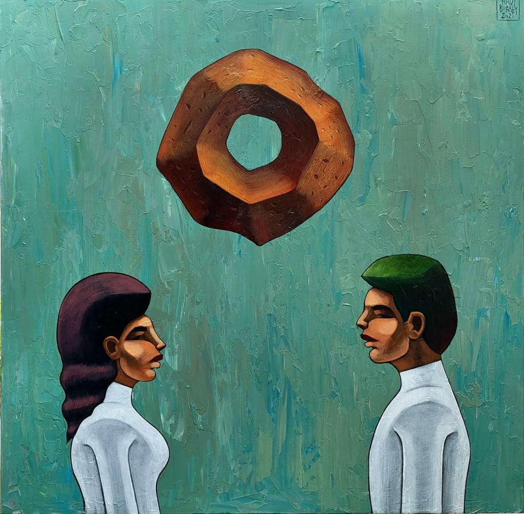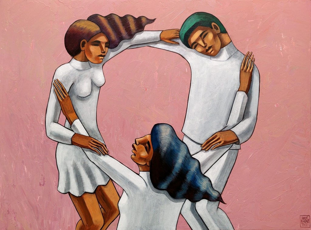 His latest exhibition, Eden Dance is born from the pandemic and a desire to reconnect with nature. In classic Boraey fashion, the collection depicts a rich and textured fantasy world. Stoic figures feature center-stage in almost every artwork. Sharp-edged facial features are made sharper by their geometric figures — a stark contrast to the muted backdrops that lay behind them.