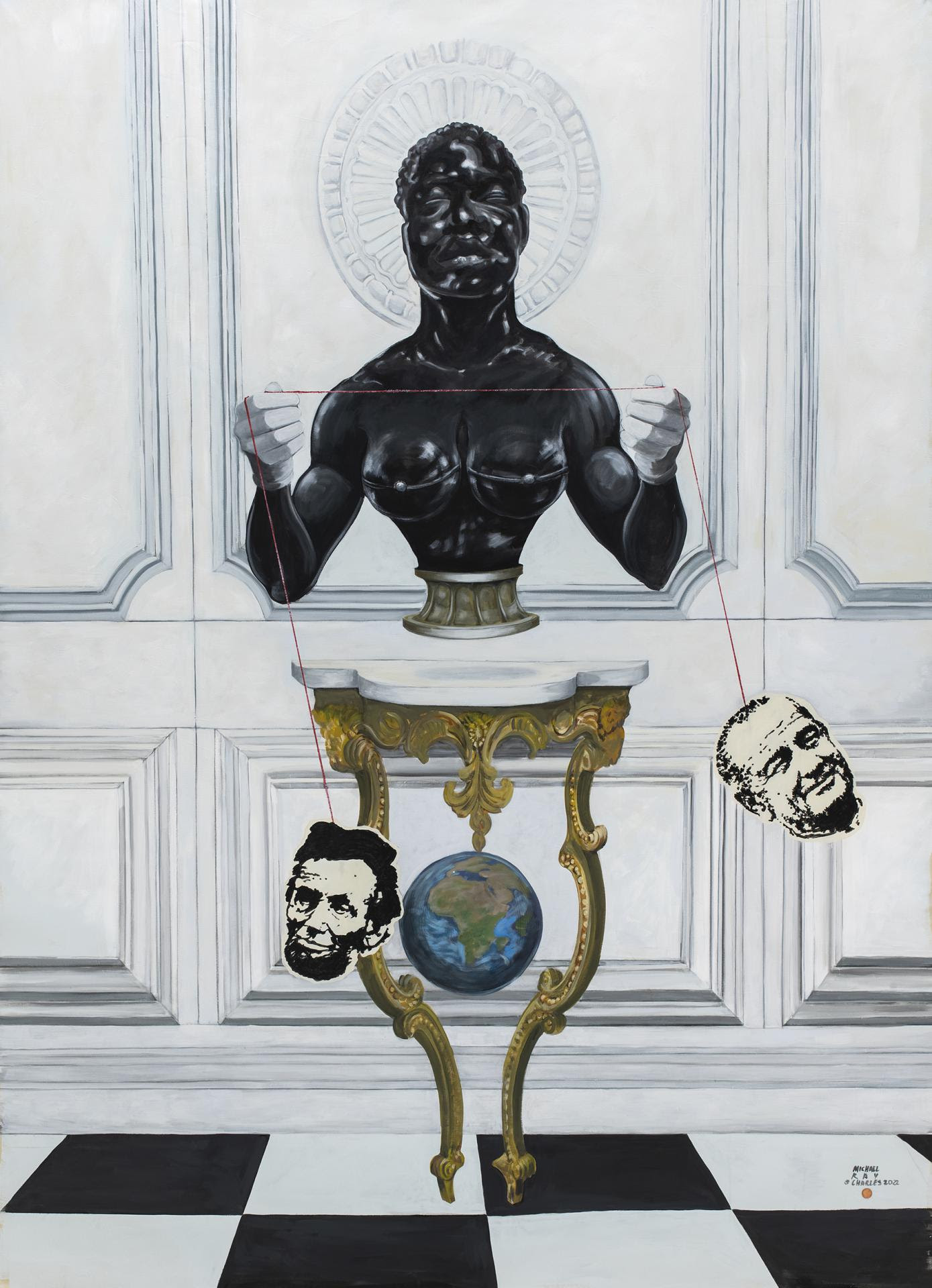 “VENI VIDI” marks the artist’s long-awaited return to the New York scene and a new stage in his career. With this exhibition, the artist broadens his focus to encompass different forms of acutely observed political discrimination. His paintings are populated by various political figures who played a part in the history of the abolition of slavery and segregation, from Abraham Lincoln to Lyndon B. Johnson. He also takes a closer look at the major forms of discrimination that mark contemporary society, including the LGBTQ question and gender differences. The exhibition presents a collection of large-format pieces and a series of small paintings featuring masked, enigmatic portraits. Michael Ray Charles moves subtly between idea and image with a burlesque, surrealist and theatrical palette applied to the “minstrel shows”, the popular 19th-century entertainment that ridiculed the Black community. He has now added a new vocabulary to his palette: the language of dandyism, a cultural style that serves as a powerful social marker, and of masquerade ceremonies, highlighting ancient African traditions in order to examine these sensitive questions from several angles.