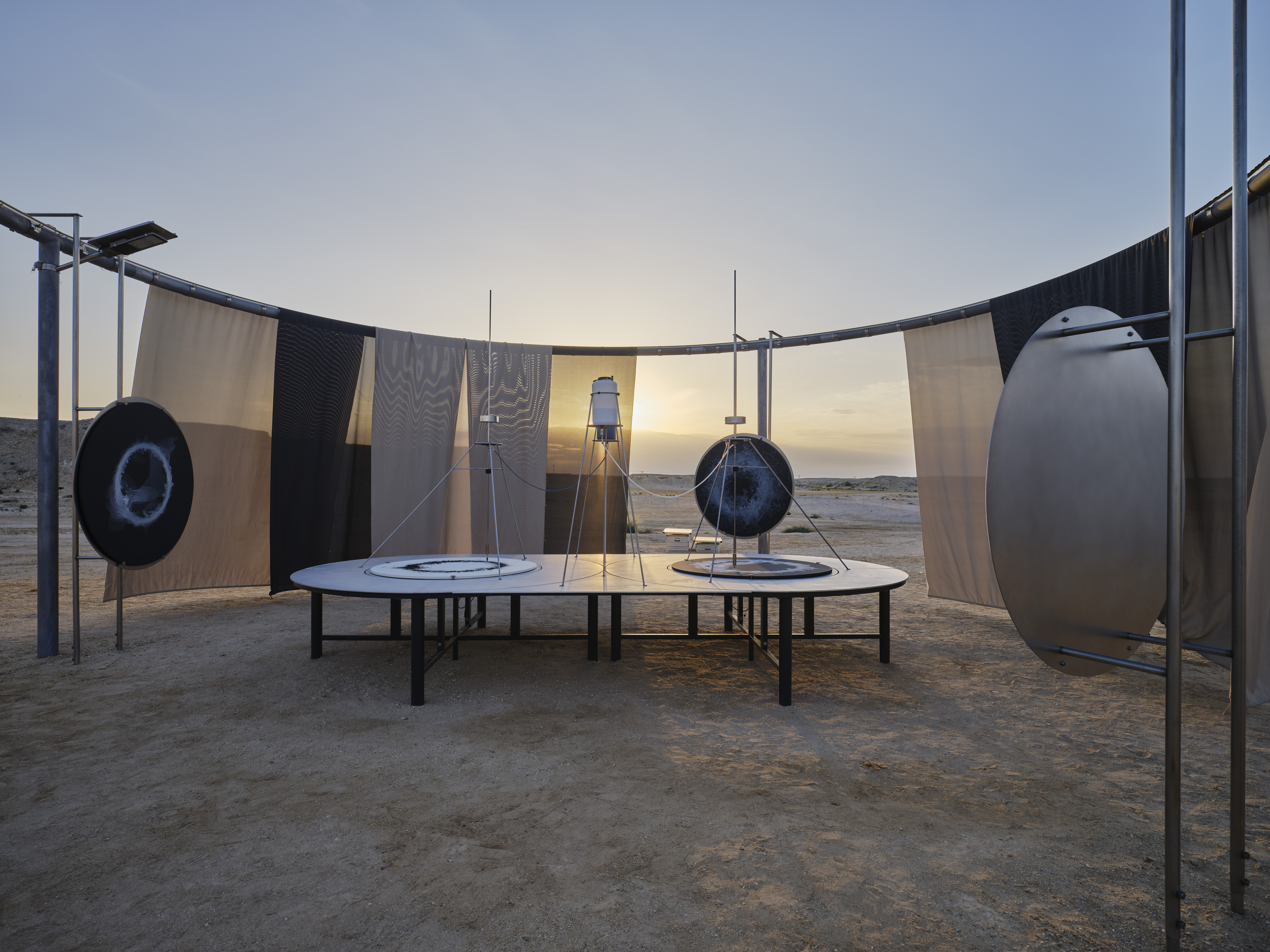 - Saltwater-drawing observatory – Two circular canvases – one white and the other black – turn slowly on motors as water, mixed with black and white pigments respectively, drips down onto the spinning surfaces. The wind causes the drawing utensil to move across the surface of the turning page, leaving undulating marks upon the surface. The drawings, portraits of the weather conditions at the location, are then periodically shown at The National Museum of Qatar.