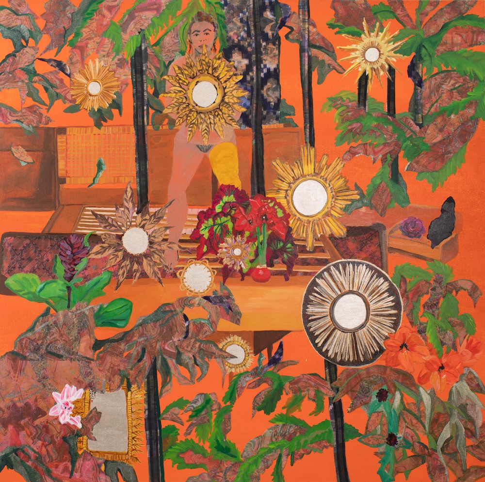 Mukherjee (b. Boston, 1966) similarly explores the changing environments. Using the forest as a means of expressing connection with nature and time, she innovatively prints present day mass media images from climate change and feminist protests onto jamdani sari fabrics that are collaged into her paintings, often appearing as hybrid or invented groves of banyan, aspen, or black cherry trees.